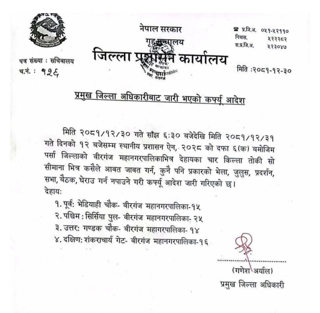पर्सा । पर्साको वीरगञ्जमा शनिबार साँझदेखि कर्फ्यु आदेश जारी भएको छ । दुई समुदायबिच भएको झडपले उग्र रूप लिएपछि जिल्ला प्रशासन कार्यालयले कर्फ्यु आदेश जारी गरेको हो ।