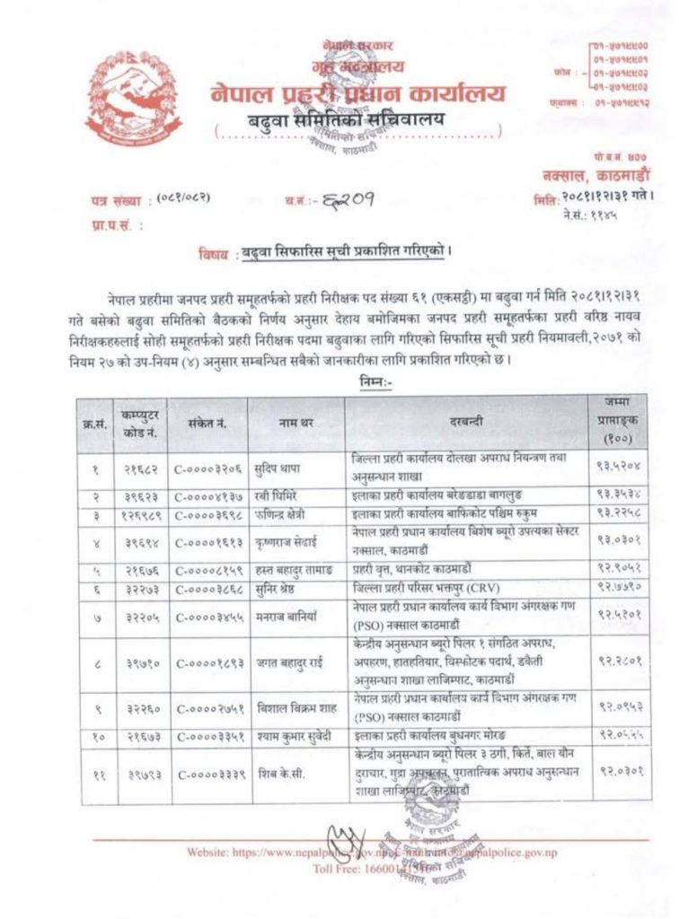 बढुवा सिफारिसको पहिलो नम्बरमा सुदिप थापा रहेका छन् । यसैगरी, दोस्रोमा रबी घिमिरे, तेस्रोमा फणिन्द्र क्षेत्री, चौथोमा कृष्णराज सेढाईं र पाँचौमा हस्तबहादुर तामाङ छन् ।उनीहरूलाई एक हप्तामा दर्ज्यानी चिह्न प्रदान गरेर पदस्थापन गरिनेछ ।