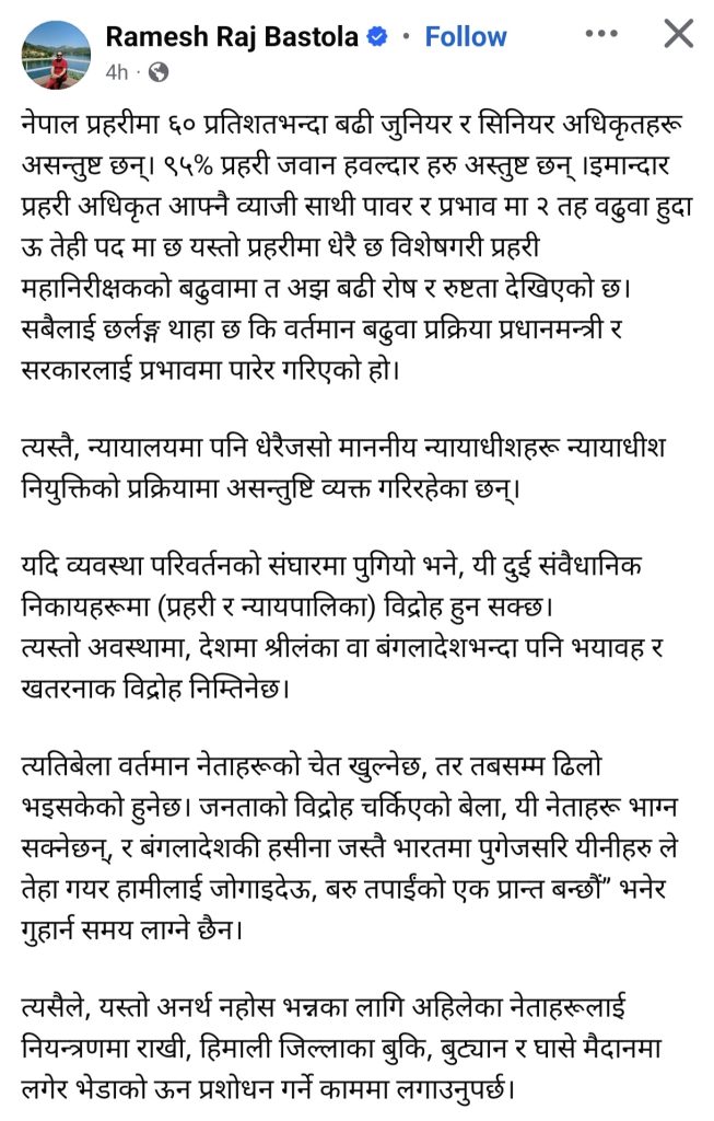 त्यस्तो अवस्थामा, देशमा श्रीलंका वा बंगलादेशभन्दा पनि भयावह र खतरनाक विद्रोह निम्तिनेछ।