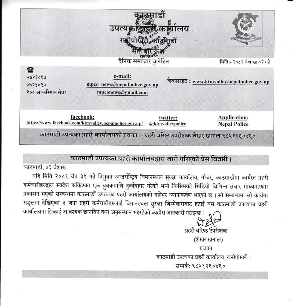 काठमाडौँ । त्रिभुवन अन्तर्राष्ट्रिय विमानस्थलमा दुबईबाट फर्किएका सञ्जय ओझालाई दुर्व्यवहार गर्ने तीन प्रहरीलाई जिम्मेवारीबाट हटाइएको छ । उनीहरुलाई काठमाडौँ उपत्यका प्रहरी कार्यालय रानीपोखरीमा तानिएको त्रिभुवन अन्तर्राष्ट्रिय विमानस्थल सुरक्षा कार्यालयका प्रमुख एसएसपी सोमेन्द्र सिंह राठौरले जानकारी दिए ।