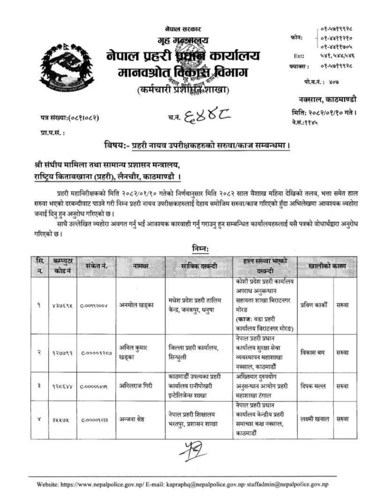 काठमाडौं । नेपाल प्रहरीले एकैपटक १२१ प्रहरी नायब उपरीक्षक (डीएसपी) को सरुवा गरेको छ ।प्रहरी महानिरीक्षक (आईजीपी) दिपक थापाको बुधबारको निर्णयअनुसार वैशाख महिनादेखिको तलब भत्तासमेत हाल सरुवा भएको दरबन्दीबाट पाउनेगरी डीएसपीहरूको सरुवा गरिएको हो ।