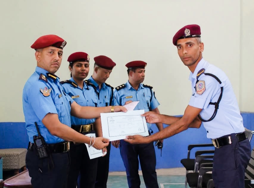 प्र.ज.-२८ गरी जम्मा ३५ जना प्रशिक्षार्थीहरु मध्य (क) ग्रेडमा ३१ जना र (ख) ग्रेडमा ०४ जनाले सफल्ता पुर्बक हासिल गरी उक्त तालिम यस कार्यालयका सि.प्र.अ./जु.प्र.अ.खटि आएका प्रशिक्षक तथा प्रशिक्षार्थीहरुको उपस्थितीमा आज मिति २०८२।०१।१२ गते १३:४५ बजेको समयमा यस कार्यालयका कार्यालय प्रमुख प्रहरी उपरीक्षक भुवनेश्वर तिवारीको प्रमुख आतिथिमा तालिममा सहभागी प्रशिक्षार्थीहरुलाई प्रमाण पत्र वितरण गरी तालिम समापन भएको ।