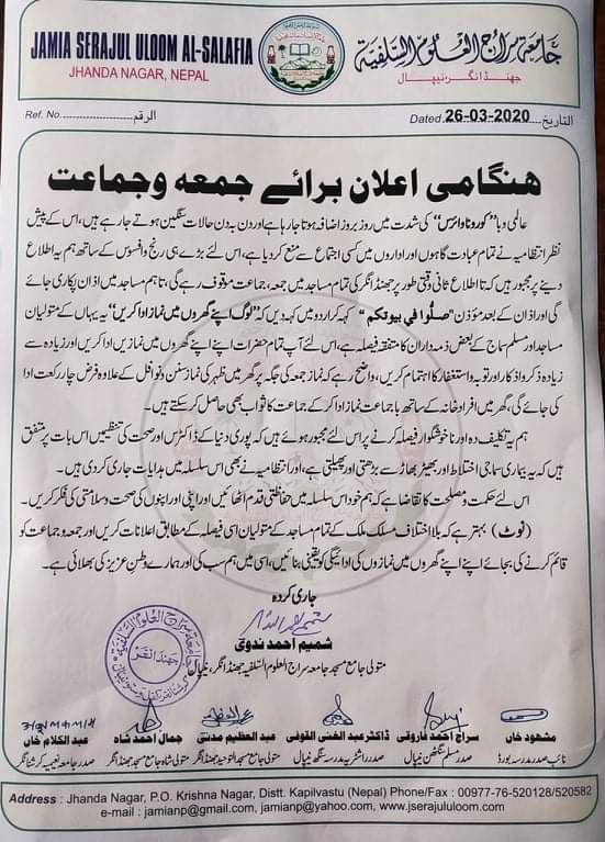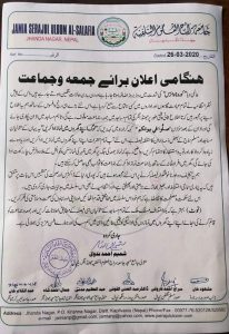 नेपाल सरकारले दिएको निर्देशन लाई मुस्लिम समुदायले समेत अपनाई कोरोना भाइसको रोकथाम गर्न र सचेतना अपनाउन, मुस्लिम समुदाय मस्जिदमा अजान दिने तर नमाज पढ्नको लागि मस्जिदमा ४ जना मात्र नमाज पढ्ने भिड भाड न गर्ने र भोलि आउने शुक्रवार को नमाज आ -आफ्नो घर मा पढी नेपाल सरकार ले दिएको निर्देशनको पालन गर्ने आग्रह मौलाना मसहूद खां नेपाली लगायत समुदाय का जिम्मेवार व्यक्ति हरु ले गरेका थिए ।