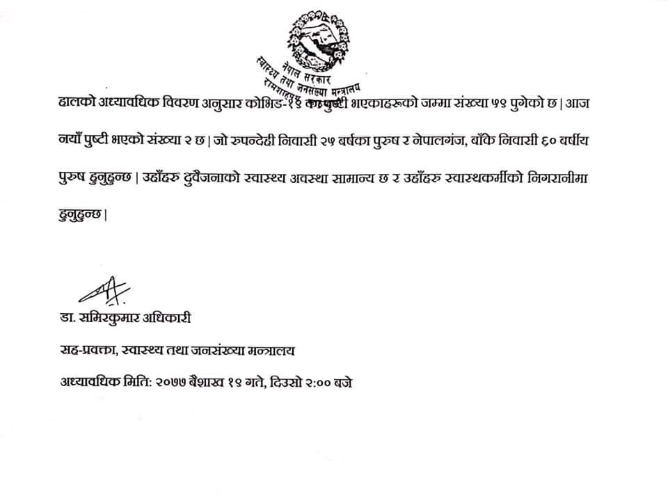 उनीहरुमध्ये एकजनाको राष्ट्रिय जनस्वास्थ्य प्रयोगशालामा गरिएको परीक्षणबाट कोरोना पुष्टि भएको हो। अर्काको नेपालगञ्जस्थित ल्याबमै गरिएको पिसिआर परीक्षणमा कोरोना देखिएको हो।उनीहरु दुईमध्ये एकजना विदेशबाट आएको खुलेको छ।