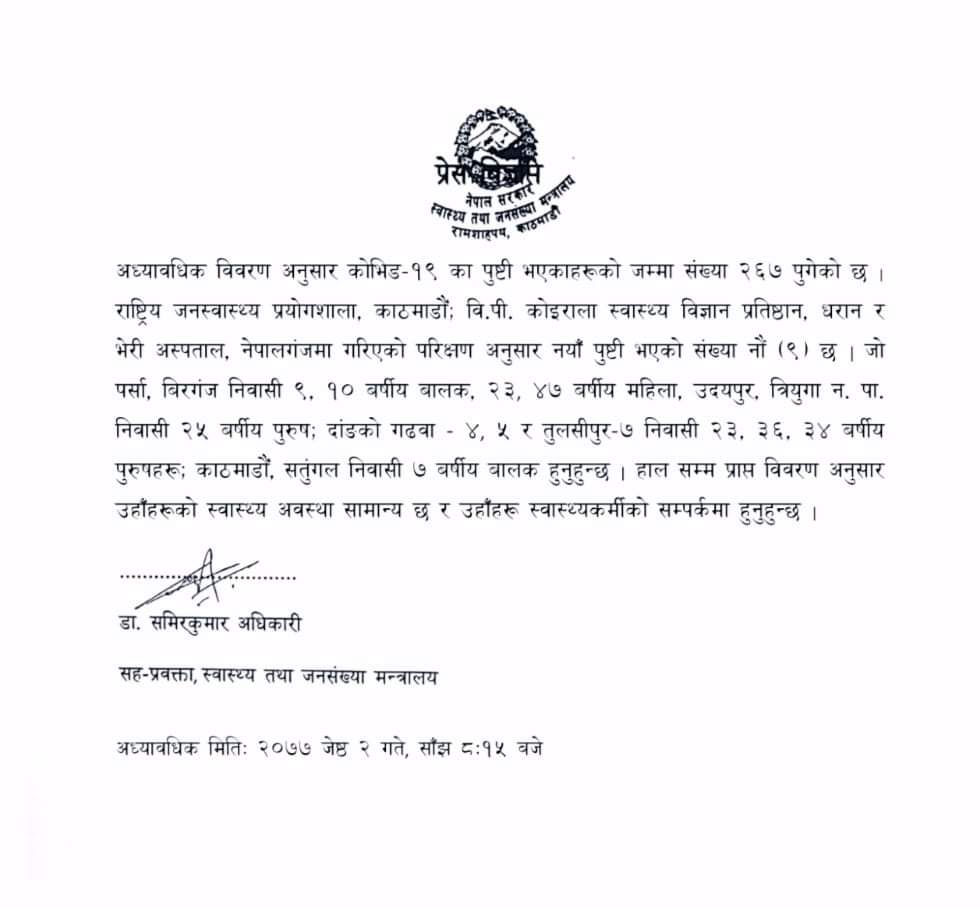 त्यसैगरी बिरंगजका ९ र १० वर्षका बालक, २३ र ४७ वर्षिय महिला, उदयपुरका २५ वर्षिय पुरुषमा पनि संक्रमण पुष्टि भएको छ । त्यस्तै काठमाण्डौका ७ वर्षिय बालकमा पनि संक्रमणको पुष्टि भएको छ । यससंगै नेपालमा कोरोना संक्रमितको संख्या २६७ पुगेको छ ।
