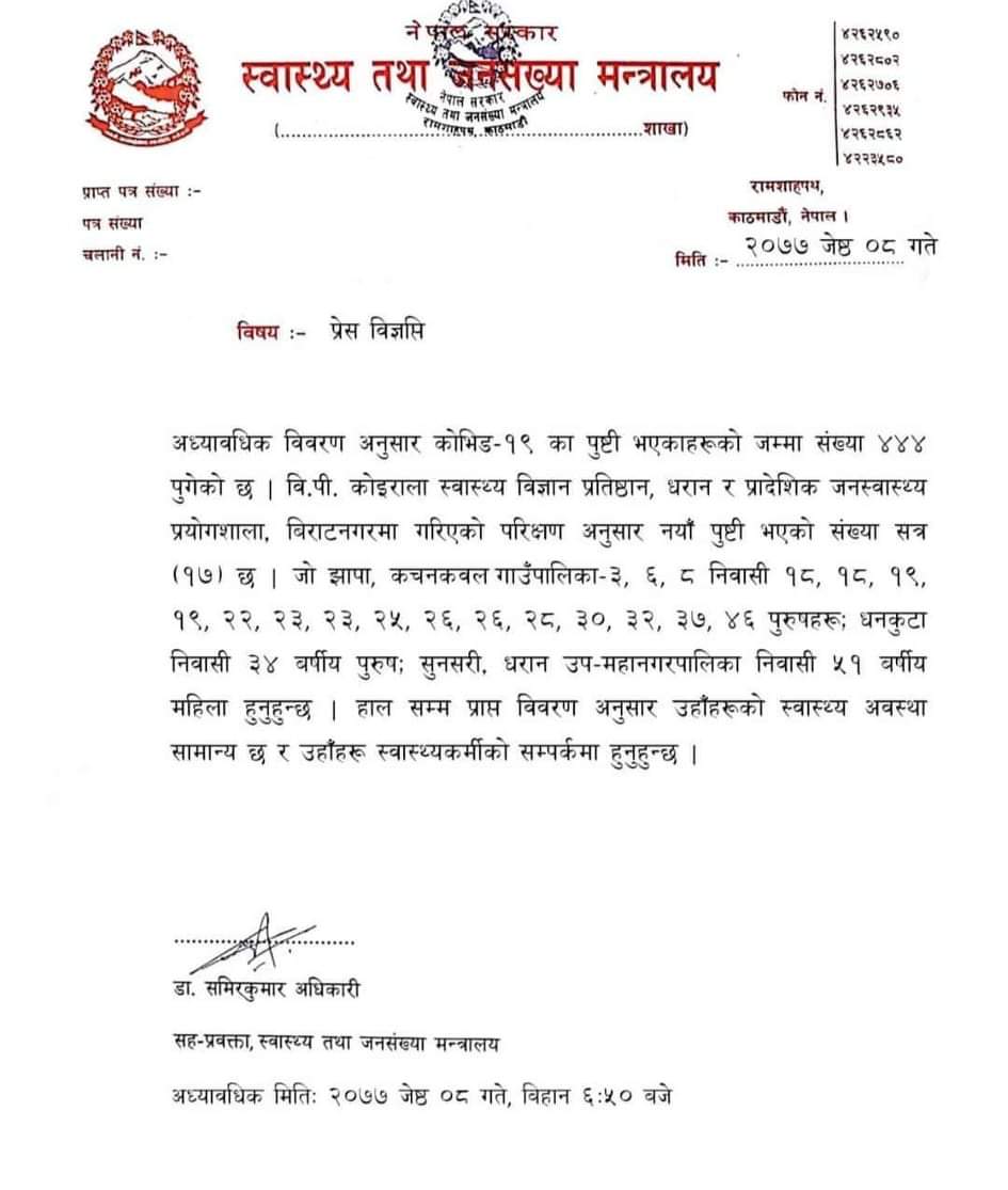 थप १७ जनामा कोरोना संक्रमण पुष्टि संक्रमितको संख्या ४ सय ४४ पुग्यो
