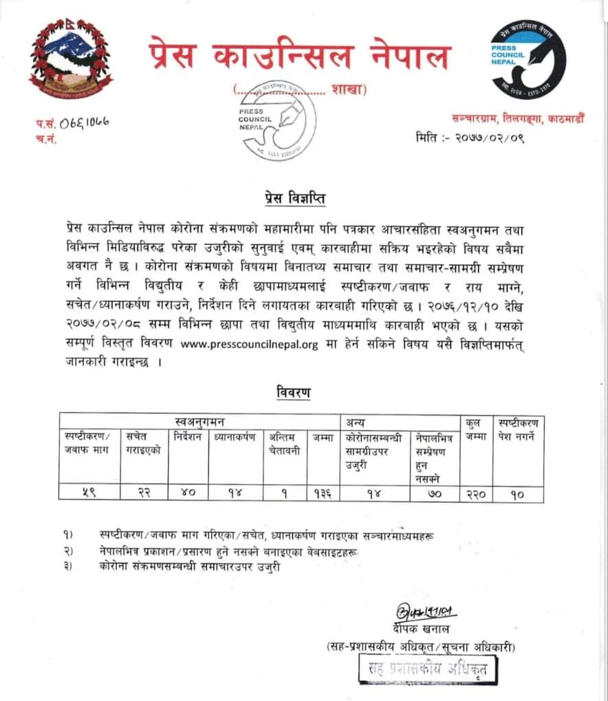 काठमाडौं समाचार संस्थाको नियामक निकाय प्रेस काउन्सिल नेपालले पत्रकार आचारसंहिताको उल्लंघन गरेको भन्दै विभिन्न ७० अनलाइनलाई नेपालमा नखुल्ने गरि ब्लक गर्ने निर्णय गरेको छ। चैत ११ गतेदेखि जेठ ८ गतेसम्म जथाभावी तथ्यहीन खबर सम्प्रेण गरेर भ्रम फैलाउने गरेको भन्दै प्रेस काउन्सिलले ७० वटालाई ब्लक गरिएको जनाएको छ। यस्तै, अन्य १ सय ३६ अनलाइनहरुलाई स्पष्टीकरण सोधिएको छ। यस्तो छ ब्लक भएका अनलाइन न्यजहरु