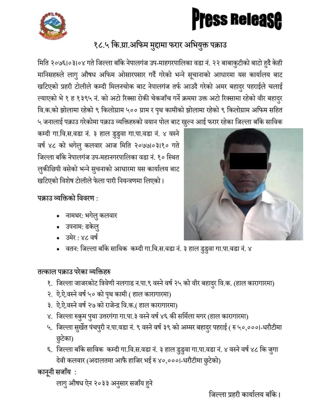 साथै जिल्ला प्रहरी कार्यालयको टोलीले लागु औषधका फरार अभियुक्त भगेलु कलवारलाई पक्राउ गरेको छ । १८ किलो अफिमसहित पक्राउ परेका पाँच जनाले पोलेपछि कलवार पक्राउ परेका हुन् । अरु पाँच जना असार ४ गते पक्राउ परेका थिए ।