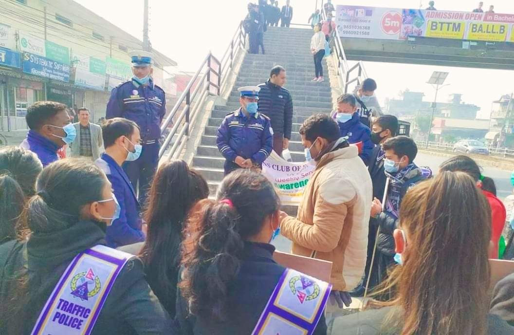 (सागर थापा) दाङ । बुटवल उपमहानगरपालिका वडा नं.१० कालिकानगर र योगीकुटी स्थीत सडकमा लुम्बिनी प्रदेश ट्राफिक प्रमुख एसपी डम्मर बिक समेतको प्रशिक्षक टोलीले बुटवल कालिका मानवज्ञान उच्च माध्यमिक बिद्यालय कालिकानगर, मणिमुकुन्द कलेज योगिकुटी बुटवलमा अध्ययनरत बिधार्थीहरु र लायन्स क्लव अफ बुटवल संसारका पदाधीकारीहरुको उपस्थितीमा ट्राफिक नियम सम्बन्धी प्रशिक्षण दुदै । आकाशे पुलको प्रयोग गरौं सडक दुर्घटनाबाट बचौं ” भन्ने उद्देश्यका साथ आकाशे पुलको प्रयोग गराउन व्यवहारीक अभ्यास गराईएको लुम्बिनी प्रदेश ट्राफिक प्रमुख एसपी बिकले जानकारी दिनुभएको छ ।