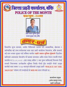 (महेन्द्र सिंह) बाँके । प्रहरी प्रधान कार्यालय काठमाडौंको विभागीय मूल्य मान्यता,आदेश निर्देशनको पालना गरी व्यवसायिक, ईमान्दार र कर्तव्यनिष्ठ भई उच्च मनोवलका साथ वडा प्रहरी कार्यालय नेपालगंज, बाँके दरबन्दी भई हाल भन्सार सुरक्षा गार्ड बाँकेमा कार्यरत प्रहरी जवान सुनिता कुँवरले डिउटीमा खटिएको अवस्थामा चेकजाँच गर्ने क्रममा भारतबाट अबैध रुपमा नेपाल ल्याउँदै गरेको भारतीय रू.१०,००,०००।– (दश लाख) सहित १ जना पुरुष व्यक्तिलाई नियन्त्रण लिई तस्करी नियन्त्रणमा उल्लेखनीय भूमिका निर्वाह गरेको हुँदा बाँके प्रहरी प्रमुख एसपी ओम बहादुर रानाले उत्कृष्ट कार्यको कदर स्वरुप तिनपुस्तेमा जनिने गरी नगद रु. १,०००।– पुरस्कार सहित २०७७ फाल्गुण महिनाको उत्कृष्ट प्रहरी “POLICE OF THE MONTH” घोषणा कदर-पत्र प्रदान गरिएको छ ।