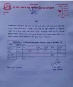 साथै मन्त्रालयले अन्तरराष्ट्रिय उडानतर्फ पनि तोकिएको गन्तव्यमा बिहिबारदेखिनै उडान सञ्चालन गर्ने व्यवस्था मिलाउन क्यानलाई निर्देशन दिएको मन्त्रालयले जारी गरेको सूचनामा उल्लेख छ। मन्त्रालयले जुन ३० सम्मका लागि उडान तालिका सार्वजनिक गरेको छ।