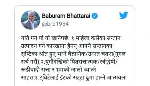 डा. बाबुरामले भनेका छन्, ‘यति गर्न यो यो खानैपर्छ : १. महिला कसैका सन्तान उत्पादन गर्ने कारखाना हैनन्, आफ्नै सन्तानका सृष्टिका श्रोत हुन् भन्ने वैज्ञानिक÷उन्नत चेतना (गुगल सर्च गरौं) । २. युगौदेखिको पितृसत्तात्मक र स्त्रीद्वेषी÷रूढीवादी सत्ता र भ्रमको जालो च्यात्ने साहस । ३. ट्विटेलाई इँटको सट्टा ढुंगा हान्ने आत्मवल !’