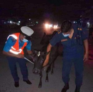 दुर्घटना न्यूनीकरण गर्न दाङको लमहीमा छाडा चौपायाको घाटीमा रातिमा चम्कीने डोरी लगाईयो