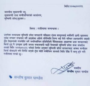 लुम्बिनी प्रदेशका भौतिक पूर्वाधार बिकास मन्त्री सन्तोष पाण्डेयद्वारा राजीनामा