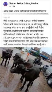 बाँके । प्रहरीले नेपालगन्जबाट अवैध रुपमा रुपैडिया भन्सार छली ल्याइएका राँगा नियन्त्रणमा लिएको छ। शुक्रबार नेपालगन्जको कोरियनपुरबाट बेवारिसे अवस्थामा रहेका ४ राँगालाई प्रहरीले नियन्त्रणमा लिएको जनाएको छ।