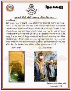 प्रहरीले बरामद गरेको एउटा सुनको बिस्कुटमा गोल्ड एक किलो देखिएको छ । पक्राउ पर्नेहरुमा जाजरकोटको बारेकोट गाउँपालिका वडा नम्बर ६ का २२ वर्षीय राजु कार्की र वडा नम्बर ८ का २९ वर्षीय पूर्णबहादुर विक रहेका छन् ।
