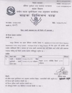 दाङ । घोराही लमही सडकखण्डको कुईरेपानी लमही सडकखण्ड अन्र्तगत मोड सुधार गर्नुपर्ने भएकाले फागुन २२ गतेदेखी ३० गते सम्म बेलुका ७ बजेदेखी विहान ४ बजेसम्म पुर्ण रुपमा बन्द हुने सडक डिभिजन कार्यालय दाङले जनाएको छ ।