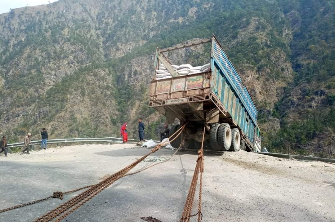 सुर्खेत । कर्णाली प्रदेश सरकार सामाजिक विकास मन्त्रालय स्वास्थ्य सेवा निर्देशनालयले जुम्लाका बालबालिकाका लागि पठाएको पाैष्टिक आहार बाेकेकाे ट्रक कर्णाली राजमार्गअन्तर्गत कालिकाेट जिल्लाकाे शुभकालिका गाउँपालिकास्थित एस माेडमा झुण्डिएको छ । ट्रककाे ५० प्रतिशत भाग सडकबाट बाहिर गएपछि उद्धारकाे प्रयास भइरहेकाे छ ।