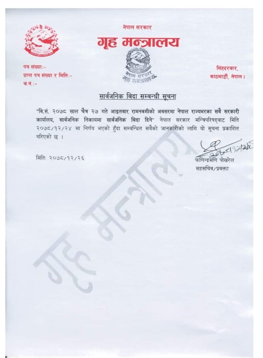 चैते दसँै रामनवमीको अवसरमा नेपाल राज्यभरका सबै सरकारी कार्यालय, सार्वजनिक निकायमा सार्वजनिक बिदा दिने मन्त्रिपरिषद्को बैठकले निर्णय गरेको गृह मन्त्रालयका प्रवक्ता फणीन्द्रमणि पोखरेलद्वारा जारी विज्ञप्तिमा जनाएको छ ।