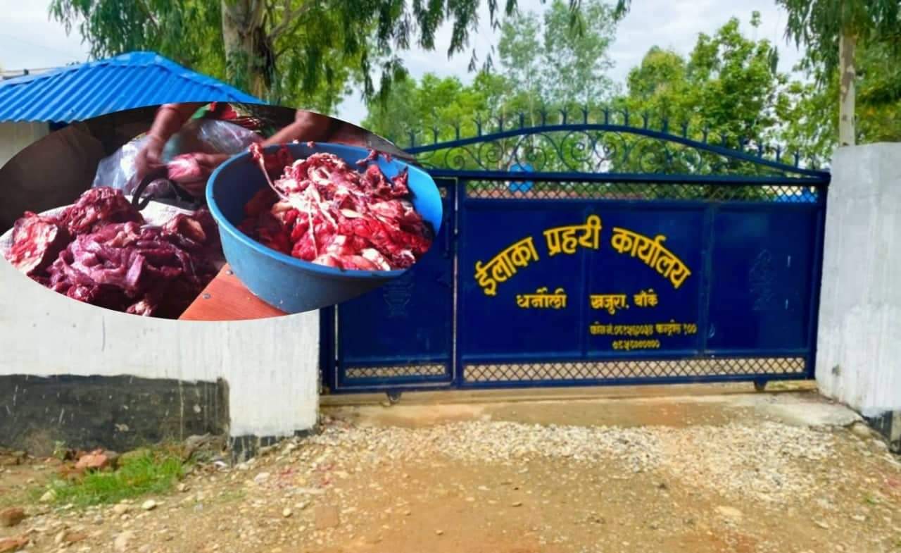 ईलाका प्रहरी कार्यालय धनौलीका प्रहरी प्रमुख प्रहरी निरिक्षक प्रेम रेग्मीले खजुरा– ६ सिमलघारीमा ३ बजे बिहान भे १ ह ४८९३ अटोमा लेड गरेर ल्याउदै गरेको ५ बोरामा पचास–पचास किलोको २ सय ५० किलो मासु, सोही ठाउका ५५ वर्षिय मुक्ति कसाई, कैलाली टिकापुरका ५३ वर्षिय भिमराज चौधरी र पुरन सुनालाई नियन्त्रणमा लिएको बताए ।