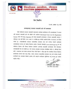 काठमाडौं । निर्वाचन आयोगले बुधबारदेखि अनलाइनबाट मतदाता नामावली दर्ता गर्न सकिने व्यवस्था मिलाएको छ ।