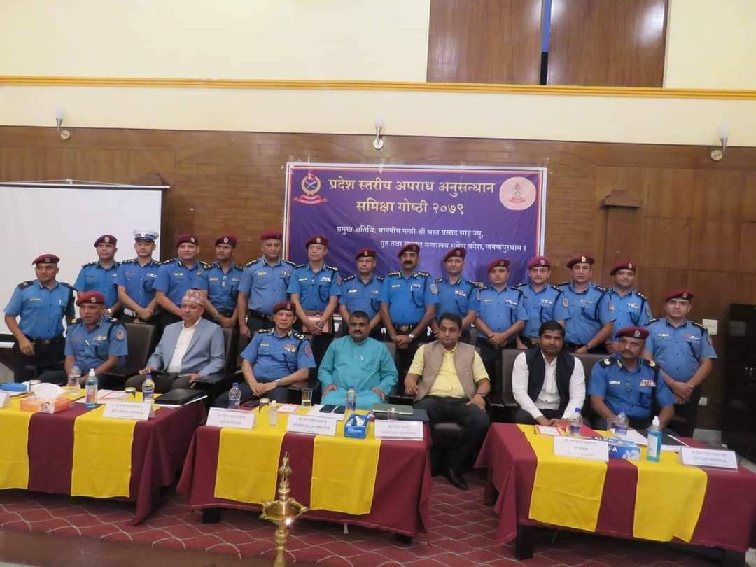 धनुषा । मधेश प्रदेशका गृह तथा सञ्चारमन्त्री भरत प्रसाद साहको प्रमुख आतिथ्यमा नेपाल प्रहरी प्रधान कार्यालय अपराध अनुसन्धान विभाग एवं मधेश प्रदेश प्रहरी कार्यालय जनकपुरधामद्वारा संयुक्त रूपमा आयोजित प्रदेश स्तरीय अपराध अनुसन्धान समीक्षा गोष्ठी २०७९ धनुषाको जनकपुरधाममा मंगलबार सम्पन्न भएको छ ।