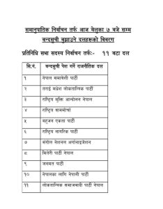 साँझसम्ममा सात दलले, मधेस प्रदेशमा ६ दलले, बागमती प्रदेशमा ७ दलले, गण्डकी प्रदेशमा ५ दलले, लुम्बिनी प्रदेशमा ४ दलले, कर्णाली प्रदेशमा ४ दलले र सुदूरपश्चिम प्रदेशमा ७ दलले बन्दसूची पेस गरेका छन् । प्रमुख राजनीतिक दलले भने अहिले बन्दसूची पेस गरिरहेका छन् ।