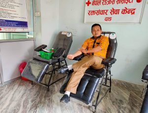 दाङ । आफ्नो जन्मदिनको अवसर पारेर दाङ घोराही उपमहानगरपालिका १५ निबासी राष्ट्रिय अनलाईन पत्रकार संघका उपाध्यक्ष एवं एबिसी संचार खबर 24 नेपाल सिधा पत्रका क्राइम ब्युरो प्रमुख पत्रकार सागर थापाले सोमबार दोस्रो पटक रक्तदान गर्नु भएको छ।