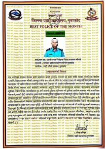ईलाका प्रहरी कार्यालय चोगते नुवाकोट दरबन्दी भई प्रहरी चौकी तारुका नुवाकोटमा कार्यरत प्र.ना.नि. दिपेन्द्र नारायण चौधरी (कम्प्युटर कोड ३०८२२७ र संकेत नं.C-00053296) ले आफूलाई दिईएको जिम्मेवारी आत्मसाथ गर्दै अवैध नदिजन्य पदार्थको दोहन कार्य नियन्त्रण गर्न स्थानीय पालिकाहरुसंग समन्वय गरी महत्वपुर्ण भूमिका निर्वाह गरेको, समुदाय प्रहरी साझेदारी अवधारणा अनुरुप विभिन्न जनचेतनामुलक कार्यक्रम संचालनमा प्रभावकारी भूमिका निर्वाह गरेको, चाडपर्वहरुमा हुन सक्ने सवारी दुर्घटना न्यूनिकरण गर्न ट्राफिक प्रहरीसंग समन्वय गरी आकस्मिक