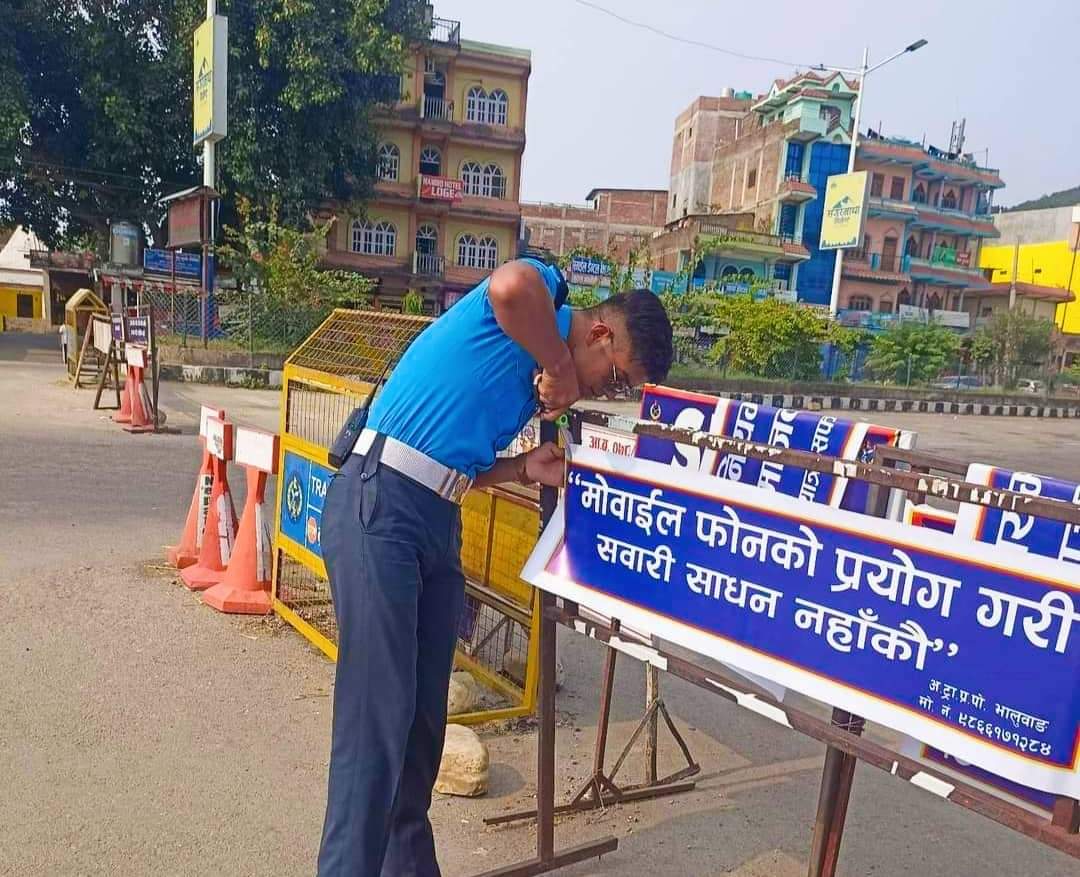 दुर्घटनाबाट बच्न जनचेतनामूलक होडिङ बोर्ड टाँस्दै भालुवाङ ट्राफिक प्रहरी