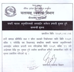 (सागर थापा) दाङ । मङ्सिर ४ गतेको प्रतिनिधि सभा र प्रदेश सभाको नर्वाचन सम्पन्न भएस ११ गतेदेखि सवारी चालक अनुमतिपत्र लाइसेन्सको अनलाइन आवेदन खोल्ने भएको छ । निर्वाचनका कारण आवेदन बन्द भएको थियो यातायात विभागले बिहीबार एक सूचना जारी गरी आवेदन खोल्ने निर्णय गरेको हो ।