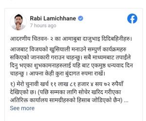 चितवनको प्रतिनिधि सभा क्षेत्र नम्बर २ बाट निर्वाचित लामिछानले चुनावी अवधिमा ११ लाख ८१ हजार ४७२ खर्च भएको बताएका छन् ।