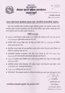 काठमाडौं । नेपाल प्रहरीले अनलाइन मार्फत कसैले चिठ्ठा पर्यो भन्दै कर भुक्तानीका लागि रकम माग गरे नदिन आग्रह गरेको छ । प्रहरीको साइबर व्युरोले सार्वजनिक सूचना प्रकाशित गर्दै अनलाइनमार्फत चिनजान भएका कसैले पनि रकम माग गरे नदिन सचेत गराएको हो ।