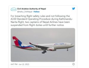 काठमाडौँ । नेपाल नागरिक उड्डयन प्राधिकरणले नेपाल एअरलाइन्सका दुई पाइलटलाई निलम्बन गरेको छ।