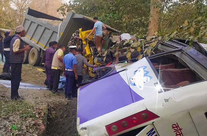 दाङ । घोराही लमही सडक अन्तर्गत बेलदमारमा टिप्परमा बस ठोक्कीदा १७ जना घाइते भएका छन् । घाइते हुनेमा राजपुर गाउँपािलका–७ लैबरूवा बस्ने बर्ष ५० की रिता बिक, भारतको मध्ये प्रदेश शिवाजी नगर बस्ने बर्ष २७ को शनि बिष्ट, तुलसीपुर – १६ बस्ने बर्ष ४२ को हेम बहादुर बस्नेत, गढवा गाउँपालिका –४ बस्ने बर्ष ३१ को शम्भु चौधरी, रोल्पाको रुन्टिगढी गाउँपालिका– ६ बस्ने बर्ष ५२ को ईन्द्र सिंह घर्तीमगर, राप्ती गाउँपालिका– ५ बस्ने बर्ष २६ की प्रमिला चौधरी, घोराही उपमहानगरपालिका– १४ बस्ने बर्ष २८ की जुन माया परियार की छोरी बर्ष ५ की एसिका परियार, सोही ठाउँ निवासी १७ की खुसी परियार, घोराही उपमहानगरपालिका– १४ बस्ने बर्ष ४६ की रामकली बिक, घोराही – ४ बस्ने बर्ष १९ की हिरा बुढामगर, तुलसीपुर – १३ बस्ने बर्ष ७७ को बिजुली बहादुर घर्तीमगर, लमही नगरपालिका– ९ बस्ने बर्ष ३० को ओवीराम कुमाल, घोरारी – ७ बस्ने बर्ष ४६ की कल्पना थापा, राजपुर गाउँपालिका– ७ बस्ने बर्ष ६७ की भद्रिकला घर्तीमगर, सोही ठाउँ निवासी बर्ष २१ को ज्ञानेन्द्र घर्तीमगर, राप्ती गाउँपालिका– १ बस्ने बर्ष ३८ को सागर बुढाथोकी र बर्दिया बाँसगढी नगरपालिका– ४ बस्ने बर्ष ३३ को हिरालाल अधिकारी रहेको प्रहरीले बताएको छ । घाइते हरुको लमहीमा उपचार भइरहेको छ ।