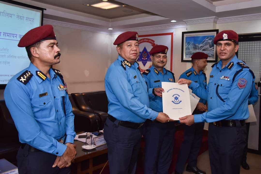 काठमाडौं । राष्ट्रिय प्रहरी प्रशिक्षण प्रतिष्ठानमा, महाराजगञ्जमा सञ्चालन भएको “पाठ्यक्रम विकास तालिम ” तेस्रो समूहको अन्तरक्रिया तथा समापन कार्यक्रम आज मिति २०८०।०४।१२ गते यस प्रतिष्ठानका कार्यकारी निर्देशक, प्र.अ.म.नि. श्री टेक प्रसाद राईको प्रमुख आतिथ्यतामा सम्पन्न भएको छ । उक्त कार्यक्रममा प्रमुख अतिथिबाट दीक्षित भई जाने प्र.उ.-१ जना, प्र.ना.उ.-१० जना, प्र.नि.-१३ जना (१ जना महिला सहित) गरी जम्मा २४ जना प्रशिक्षार्थी सिनियर प्रहरी अधिकृतहरूलाई प्रमाणपत्र वितरण एवं निर्देशन सम्बोधन गर्नुभयो ।