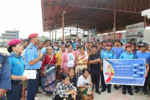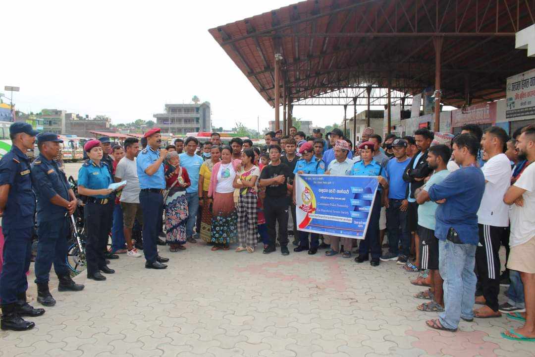 दाङ । समुदाय प्रहरी साझेदारी कार्यक्रम अन्तर्गत घोराही उपमहानगरपालिका वडा नं. १४ स्थित घोराही बसपार्कमा “अन्तराष्ट्रिय मानव बेचबिखन विरुद्धको दिवस”को अवसरमा जिल्ला प्रहरी कार्यालय दाङको आयोजना तथा यातायात ब्यवसायी, सवारी चालक, सहचालक, सवारी धनी, यात्रु, स्थानीय ब्यापारी तथा स्थानीय नागरिकहरु लगायत अन्दाजी ७०।८० जनाको सहभागितामा प्रहरी नायव उपरीक्षक राजन कुमार गौतम समेतको प्रहरी टोली खटिई सहभागिहरुलाई मानव बेचबिखन तथा ओसारपसारको परिभाषा, बेचबिखनको कारण, बेचबिखनबाट बच्ने उपायहरु, मानव बेचबिखन तथा ओसारपसार नियन्त्रण गर्न बनेको बिद्यमान कानूनी प्रावधान, मानव बेचबिखन हुन लागेको थाहा पाएमा प्रहरीलाई खबर गर्ने माध्यम लगायत बिषयमा सचेतनामूलक जानकारी दिनुको साथै मानव बेचबिखन तथा ओसारपसार नियन्त्रण सम्बन्धमा तयार पारिएको सचेतनामूलक पर्चा १०० थान बितरण गरिएको ।