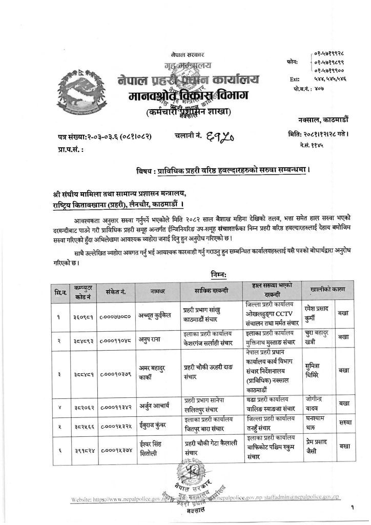 काठमाडौं । नेपाल प्रहरीले बिहीबार सरुवा सूची सार्वजनिक गरेको हो छ । आवश्यकता अनुसार सरुवा गर्नुपर्ने भएकोले मिति २०८२ साल बैशाख महिना देखिको तलव, भत्ता समेत हाल सरुवा भएको दरबन्दीबाट पाउने गरी प्राविधिक प्रहरी समूह अन्तर्गत ईन्जिनियरिङ उपसमूह संचारतर्फका निम्न प्रहरी वरिष्ठ हवल्दारहरुलाई देहाय