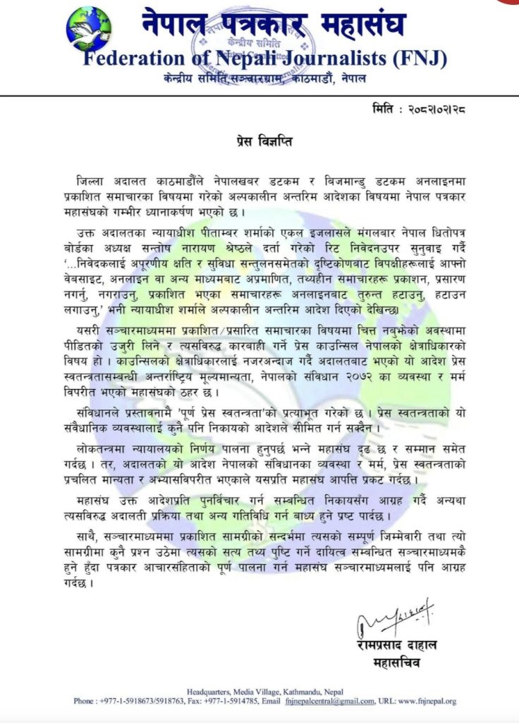 महासचिव रामप्रसाद दाहालले जारी गरेको विज्ञप्तिमा अदालतले समाचार हटाउन दिएको अल्पकालीन अन्तरिम आदेशप्रति महासंघको गम्भीर ध्यानाकर्षण भएको उल्लेख छ ।