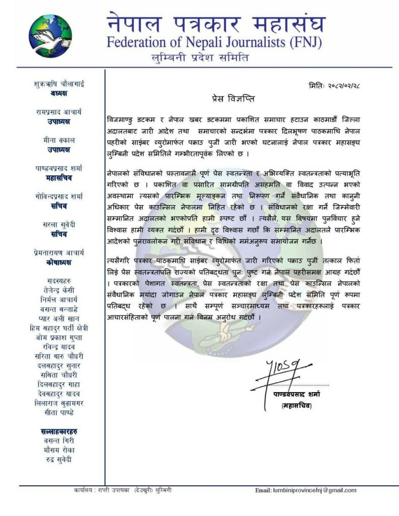 प्रेस स्वतन्त्रता र अभिव्यक्ति स्वतन्त्रता नेपालको संविधानमै प्रत्याभूत गरिएको स्मरण गराउँदै महासङ्घले अदालतबाट जारी आदेश र प्रहरीबाट जारी पक्राउ पुर्जीप्रति गम्भीर चिन्ता व्यक्त गरेको हो ।