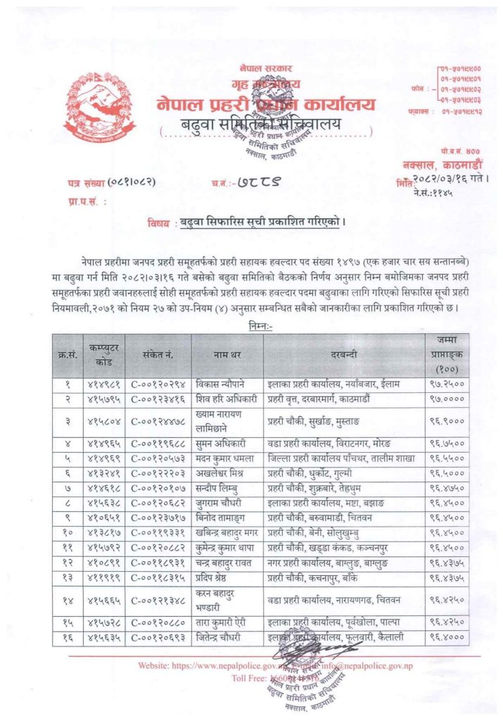 काठमाडौं । सोमबार बसेको बढ़ुवा समितिको बैठकले जनपद प्रहरी समूहतर्फका जवानहरुलाई सहायक हवल्दारमा बढुवा सिफारिस गरेको हो ।
