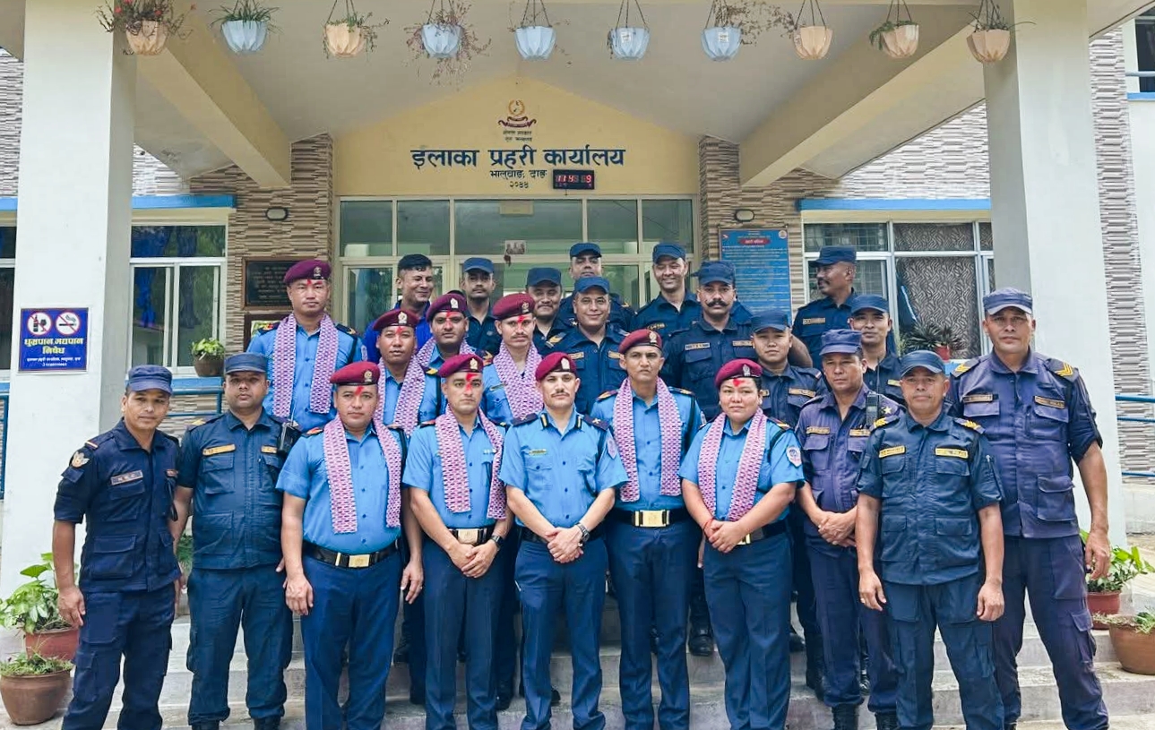 दाङ । भालुवाङ नेपाल प्रहरी प्रधान कार्यालय मानबश्रोत विकास विभाग कर्मचारी प्रशासन शाखाको बिभिन्न पत्रादेशानुसार जनपद समूह अन्तर्गत प्रहरी सहायक हवल्दार पदबाट प्रहरी हवल्दार र प्रहरी जवान पदबाट प्रहरी सहायक हवल्दार पदमा बढुवा हुनु भएका प्रहरी हवल्दार तथा प्रहरी सहायक हवल्दारलाई ईलाका प्रहरी कार्यालय भालुवाङका प्रहरी प्रमुख प्रहरी निरीक्षक पुष्कर सिंह ऐरीद्वारा दर्ज्यानी चिन्हद्धारा सु-शोभन गर्नु भई सफल कार्यकालको शुभकामना सहित आवश्यक निर्देशन दिनु भएको ईलाका प्रहरी कार्यालय भालुवाङ दाङले जानकारी दिएको छ ।