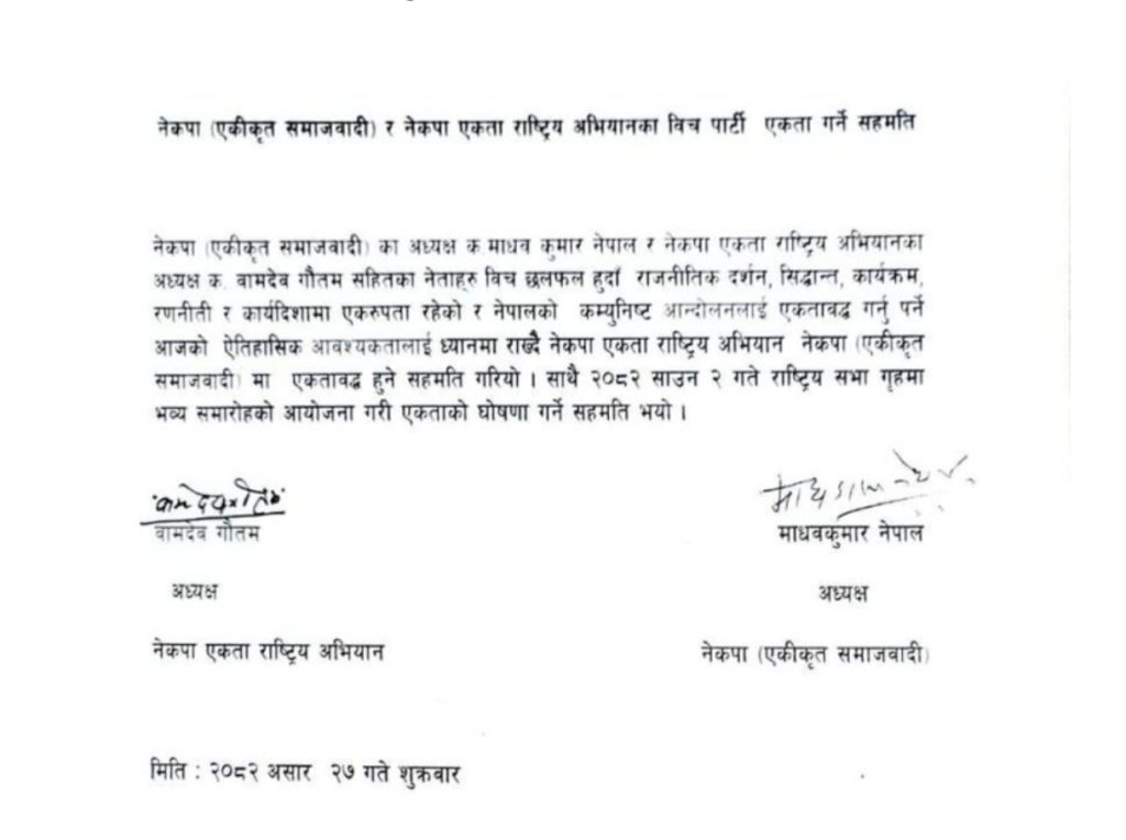 यस सम्बन्धी सहमतिमा नेकपा एकीकृत समाजवादीका अध्यक्ष माधव कुमार नेपाल र नेकपा एकता राष्ट्रिय अभियानका अध्यक्ष बामदेव गौतमले हस्ताक्षर गरेका छन्।