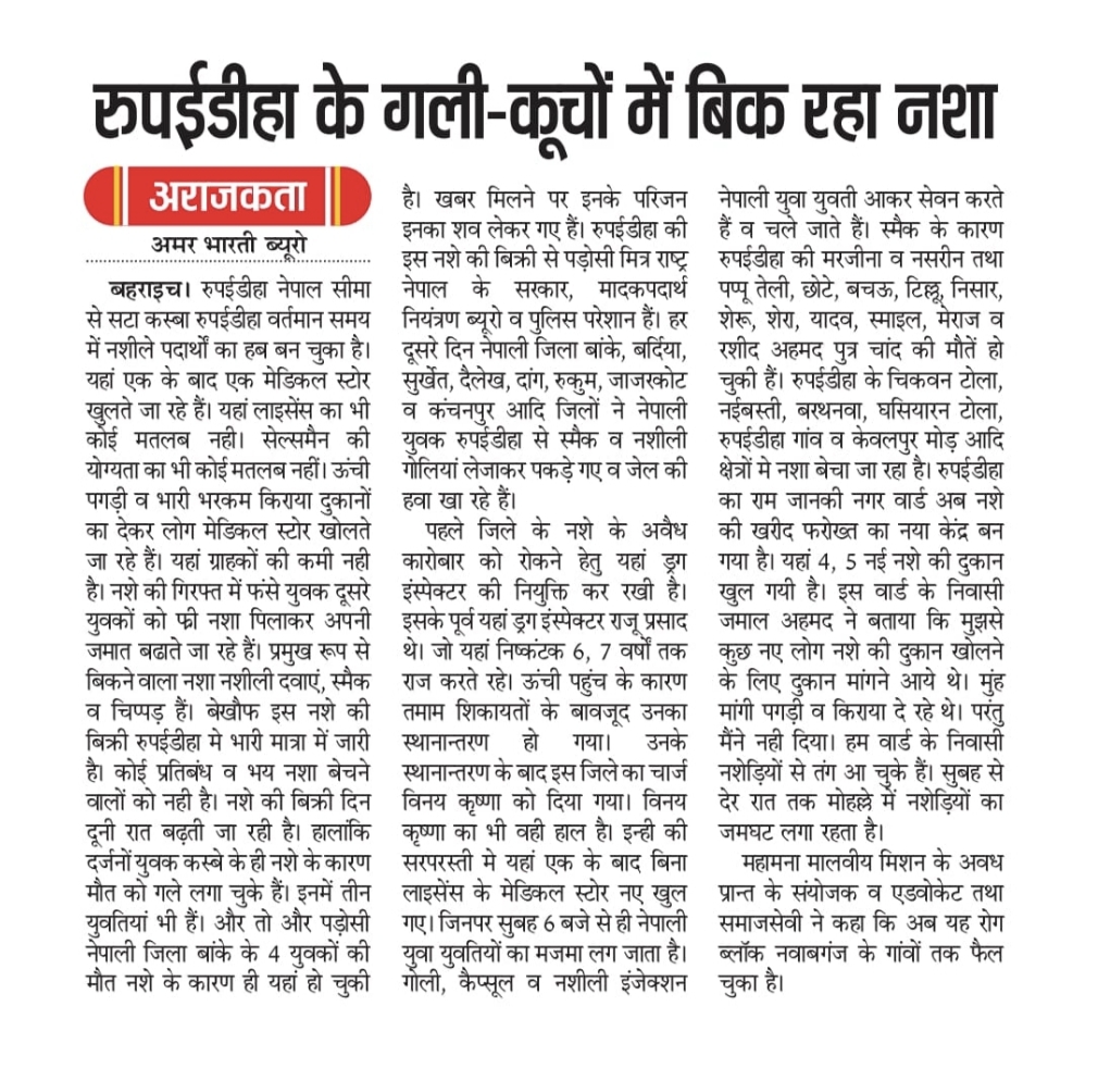 पहिले बहराइच जिल्लामा लागूपदार्थको अवैध कारोबार रोक्न यहाँ ड्रग इन्स्पेक्टर नियुक्त गरिएको थियो। यसअघि यहाँ ड्रग इन्स्पेक्टर राजू प्रसाद थिए, जो यहाँ ६-७ वर्षसम्म निर्बाध रूपमा कार्यरत रहे। उच्च सम्पर्कका कारण धेरै उजुरी हुँदा पनि उनको सरुवा भएको थियो। उनको स्थानमा विनय कृष्ण लाई जिम्मा दिइयो। विनय कृष्ण को स्थिति पनि उस्तै छ। उनकै संरक्षणमा यहाँ बिना लाइसेन्स एकपछि अर्को मेडिकल स्टोर खुलिरहेका छन्। यी पसलहरूमा बिहान ६ बजेदेखि नै नेपाली युवा-युवतीको भीड लाग्छ। गोली, क्याप्सूल र नशीला इन्जेक्सन लिएर नेपाली युवा-युवती सेवन गर्छन् र फर्किन्छन् ब्यूरोले लेखेको छ।