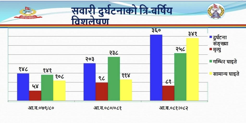 जिल्ला ट्राफिक प्रहरी कार्यालय घोराहीले मंगलबार पत्रकार सम्मेलनको आयोजना गरेर दाङ जिल्ला ट्राफिक प्रमुख उपेन्द्र बहादुर बमले आर्थिक वर्ष २०७९र०८० मा १ सय ४८ , आव २०८०र०८१ मा २०३ र आर्थिक वर्ष २०८१र०८२ मा ३६० वटा सवारी दुर्घटना भएको जानकारी दिनुभयो ।