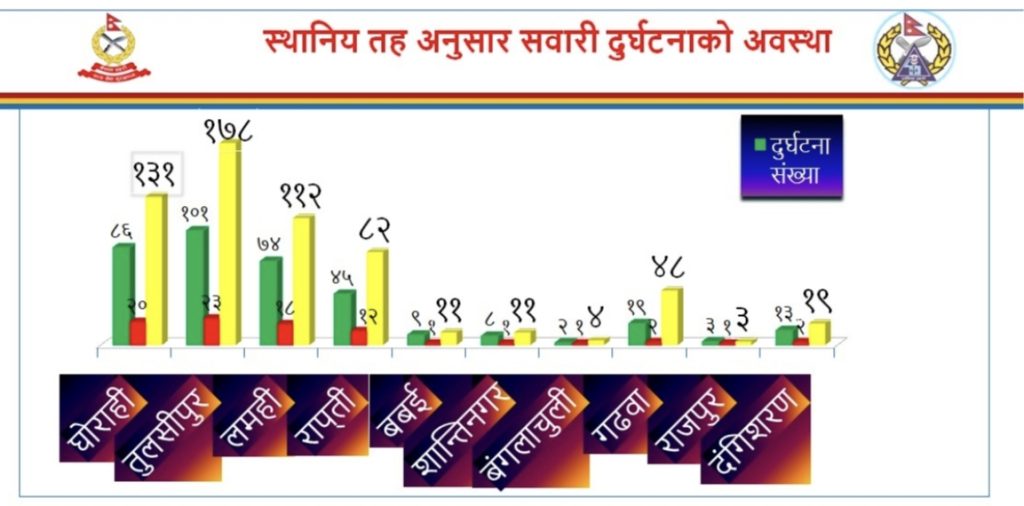जसमध्ये सबै भन्दा धेरै १ सय १ वटा सवारी दुर्घटना तुलसीपुरमा भएका छन् । घोराहीमा ८६, लमीमा ७४, राप्तीमा ४५, बबईमा ९, शान्तिनगरमा ८, बंगलाचुलीमा २१, गढवामा १९, राजपुमरा ३१ र दंगीशरणमा १३ वटा सवारी दुर्घटना भएका छन् । सबैभन्दा कम दुर्घटना हुने पालिकामा शान्तिनगर गाउँपालिका रहेको जिल्ला ट्राफिक प्रहरी कार्यालय दाङको तथ्यांक रहेको दाङ जिल्ला ट्राफिक प्रमुख प्रहरी निरीक्षक बमले जानकारी दिनुभएको छ ।