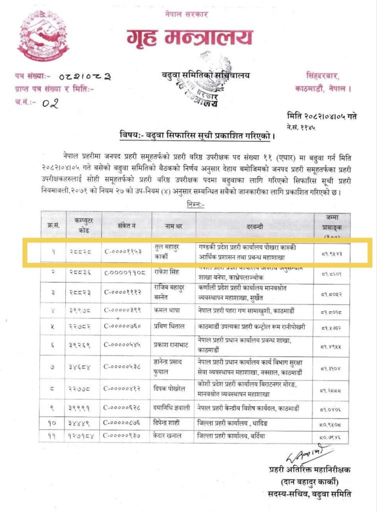 सिफारिस हुने एसपीहरूमा एक नम्बरमा तिलबहादुर कार्की, प्रकाश रानाभाट, कमल थापा, राकेश सिंह, राजीव बस्नेत, दीपक पाेखरेल, केदार खनाल, ज्ञानेन्द्रप्रसाद फुयाल, दिपेन्द्र शाही, प्रविण धिताल र दयानिधी ज्ञवाली छन्।