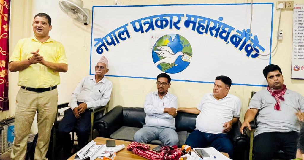 नेपाल पत्रकार महासंघ बाँके शाखाले शुक्रबार नेपालगञ्जमा आयोजना गरेको कार्यक्रमलाई सम्बोधन गर्दै उहाँले आमसञ्चार विधेयक पनि नियमन गर्ने नाममा नियन्त्रणमुखी भएको भन्दै महासंघले विरोध जनाइसकेको स्मरण गर्नुभयो । उहाँले पत्रकार महासंघको शुद्धिकरण अभियान निरन्तर चल्ने प्रक्रिया भएको भन्दै दस्तावेजीकरणका लागि नवीकरण गर्दा यसपटक आवश्यक सम्पूर्ण कागजात मागिएको बताउनुभयो ।