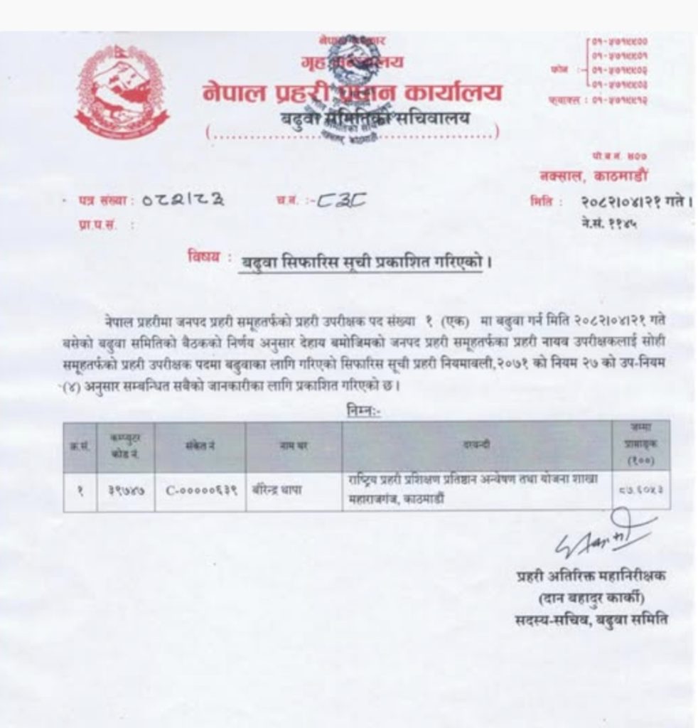 उनी यसअघिको बढुवामा छुटेका थिए। त्यस्तै, इन्सपेक्टर राजु अधिकारीको डिएसपीमा बढुवा सिफारिस भएको छ ।