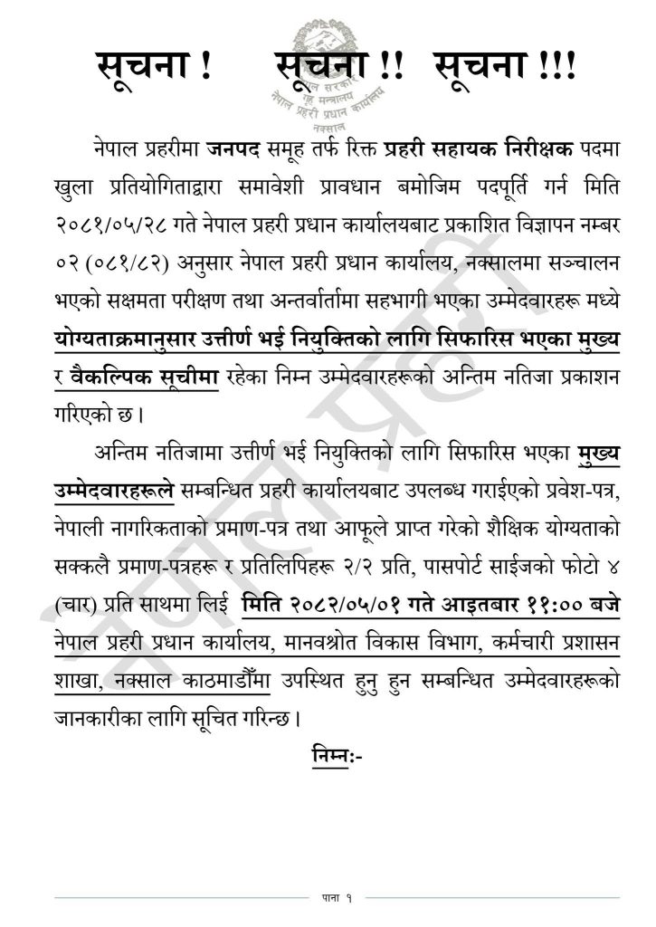 काठमाडौं । नेपाल प्रहरीमा रिक्त रहेको प्रहरी सहायक निरीक्षक (असई) पदको अन्तिम नतिजा प्रकाशन गरिएको छ । प्रहरी प्रधान कार्यालयले सोमबार नतिजा सार्वजनिक गरेको हो ।